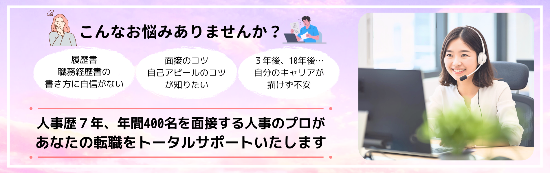 弊社には元人事部・元面接官・元営業職・女性での長期キャリア形成者など経験豊富なキャリアアドバイザーが在籍しております。是非あなたのキャリアについてお手伝いをさせてください。